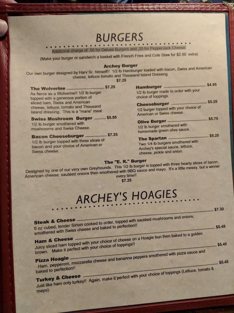 The menu at Archey's Bar & Grill presents a delightful mix of comfort food and local specialties. Breakfast options are served all day, ensuring everyone can start with favorites like fluffy pancakes or hearty breakfast burritos.